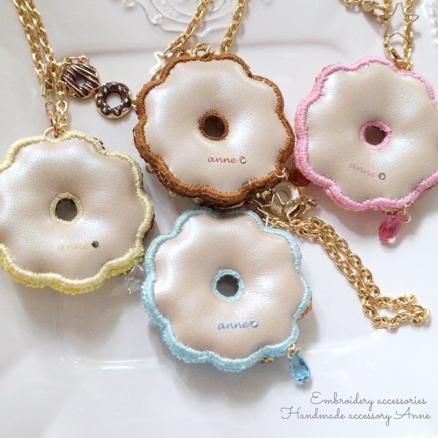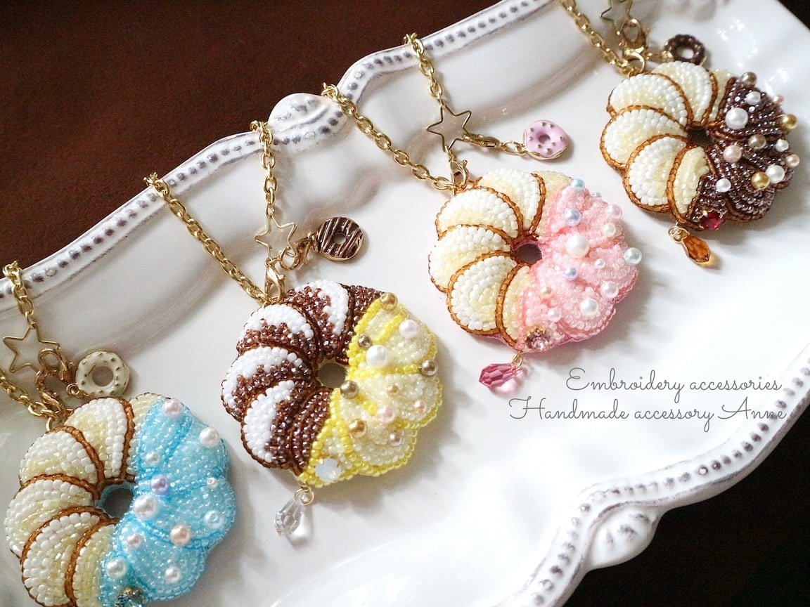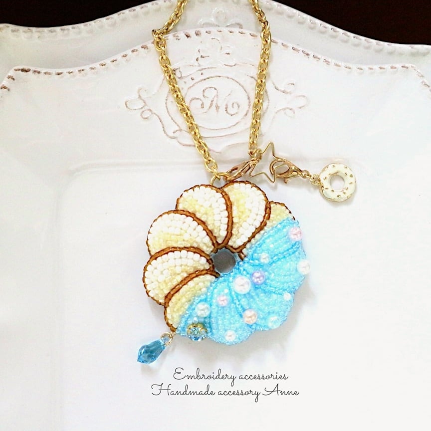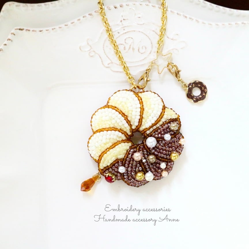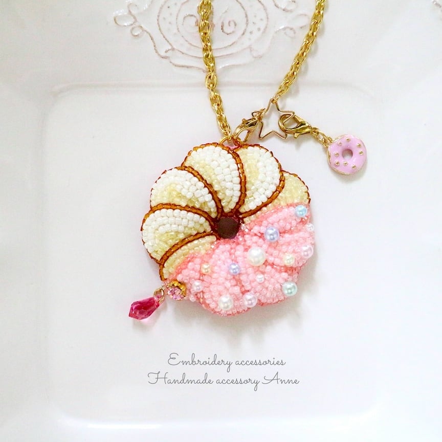 ビーズで刺繍したフレンチクルーラーモチーフのバッグチャームです。