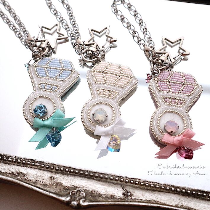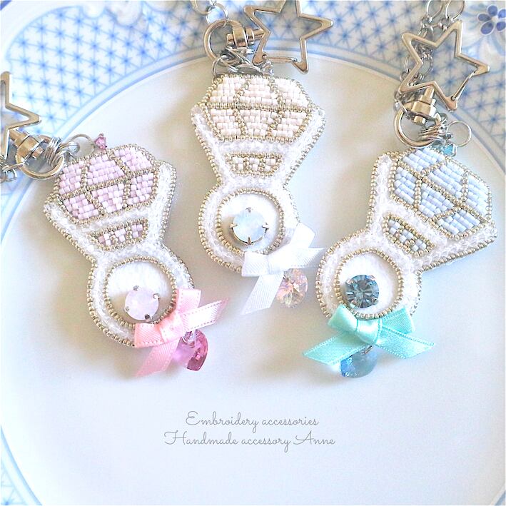 ビーズとスワロビーズで刺繍した指輪モチーフのキーホルダー・バッグチャームです。