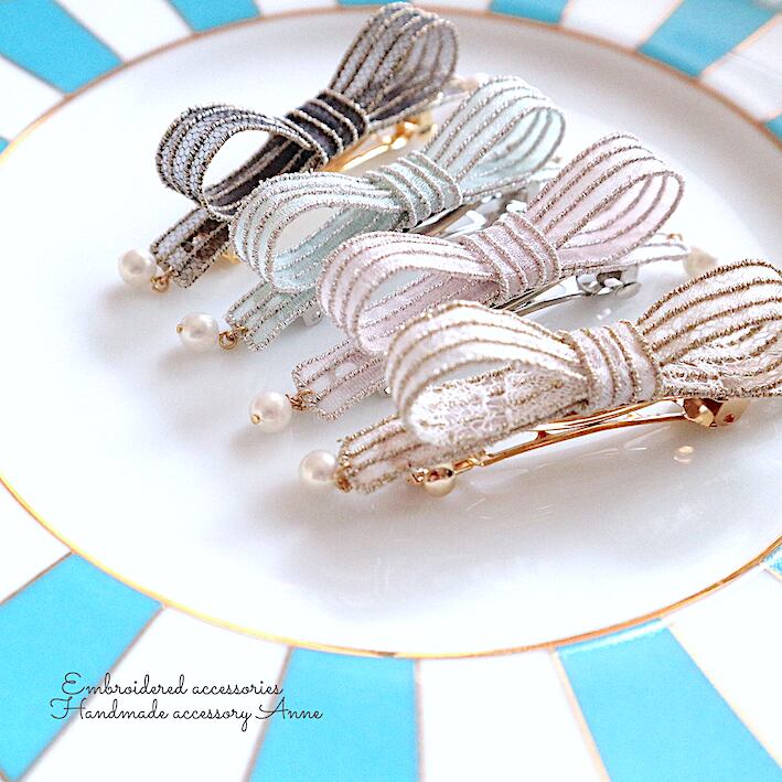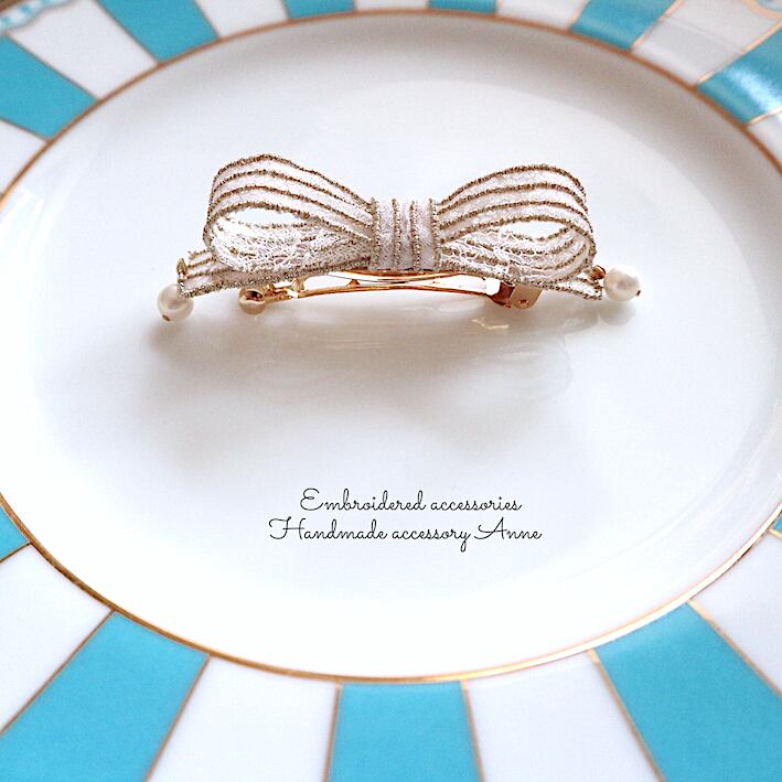 オーガンジーにワイヤーとラメ糸で刺繍した立体リボンモチーフのバレッタです。