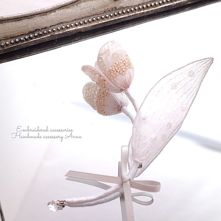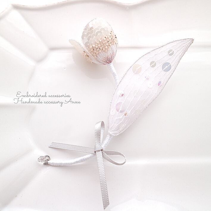 オーガンジー素材に糸やビーズ、スパンコールなどで刺繍したチューリップのコサージュです。