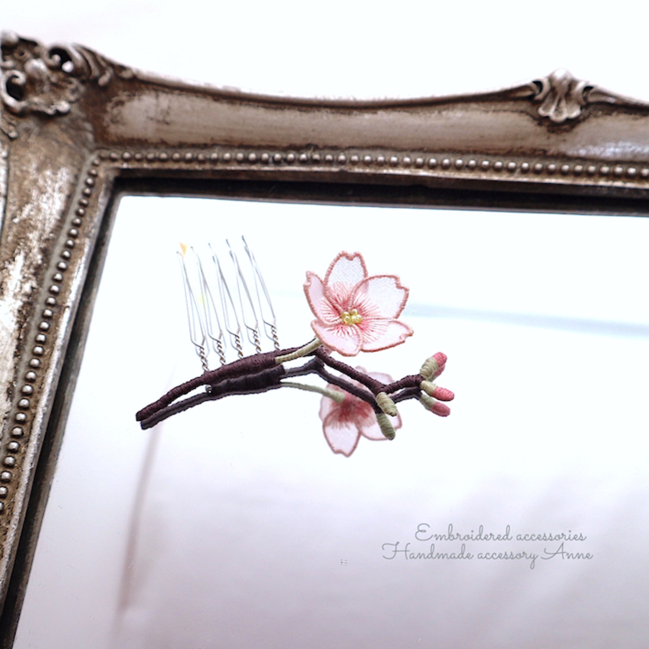 オーガンジーに刺繍した桜の花を一輪挿しに仕立てました。