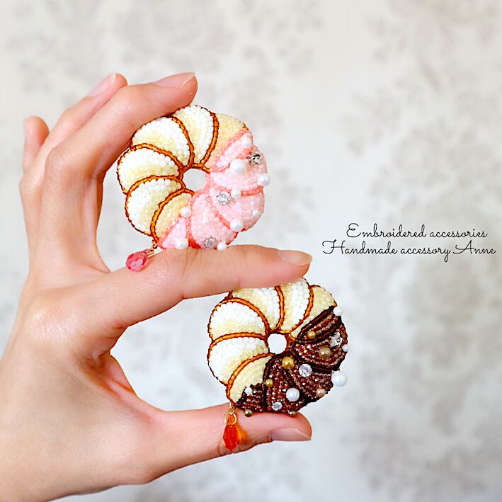 ビーズで刺繍したフレンチクルーラーモチーフのブローチです。