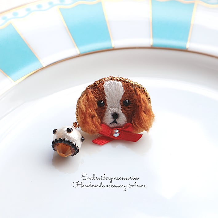 刺繍糸で刺繍したわんちゃんモチーフのピンブローチです。