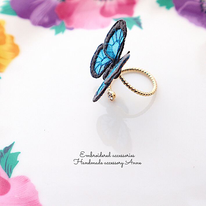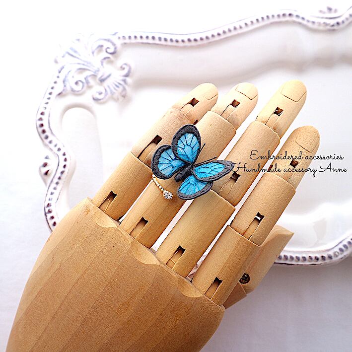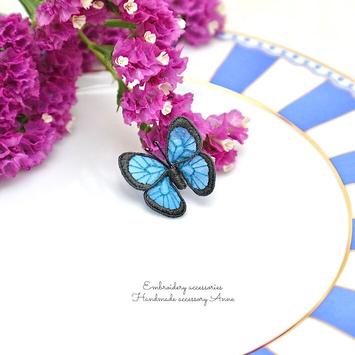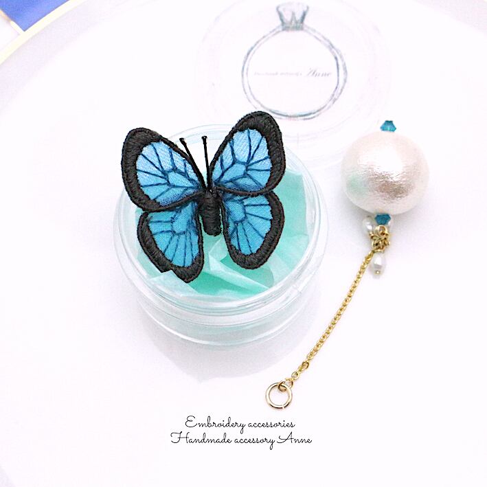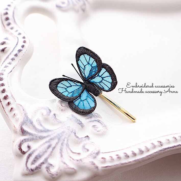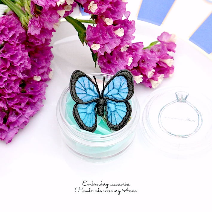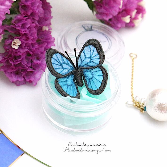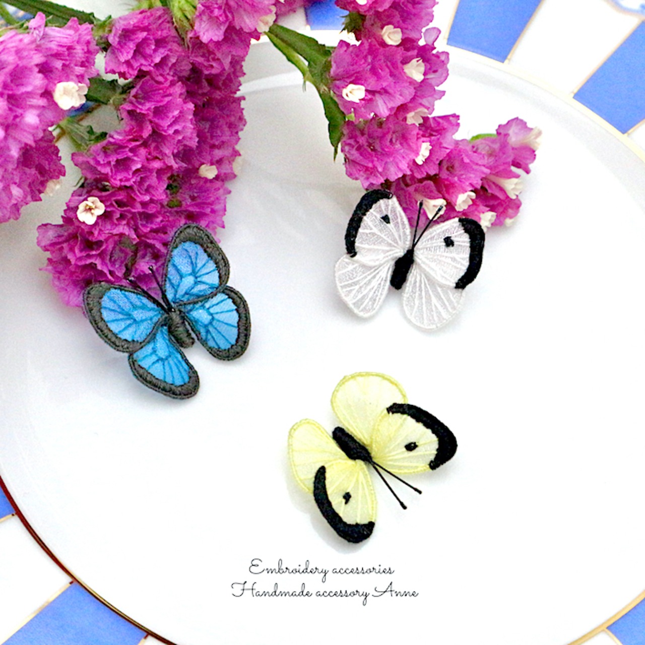 オーガンジーに糸で刺繍した蝶々の立体モチーフです。