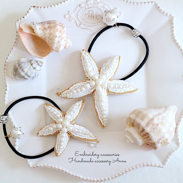 夏らしいヒトデモチーフをパールとビーズで刺繍したヘアゴムです。