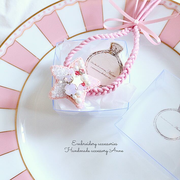 パステルカラーのビーズやスワロフスキー、パールなどで刺繍した星型のヘアゴムです。