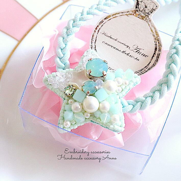 パステルカラーのビーズやスワロフスキー、パールなどで刺繍した星型のヘアゴムです。