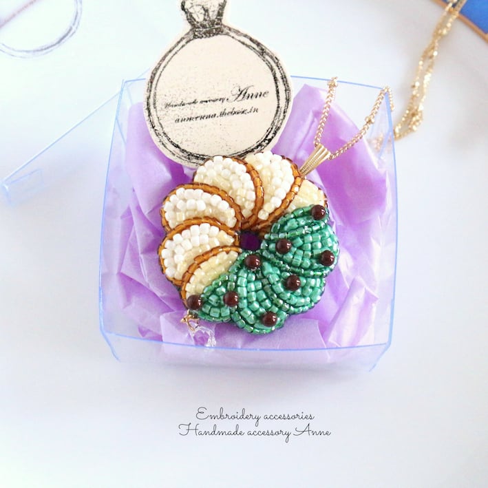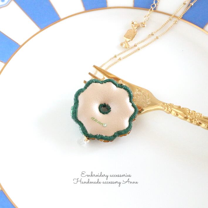 ビーズで刺繍した小さなフレンチクルーラーをネックレスに仕立てました。
