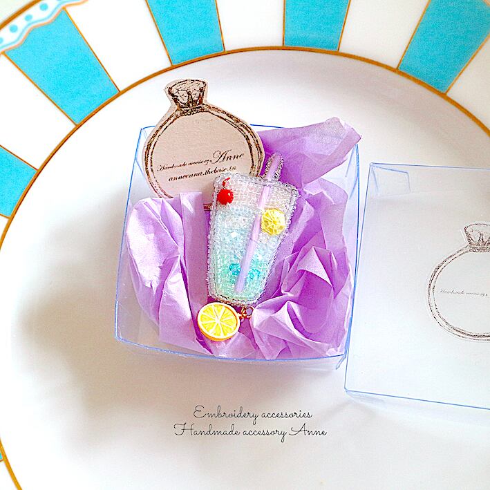 夏に飲みたくなるソーダ水をフルーティで涼し気になるようにビーズとスワロフスキーで刺繍しました。