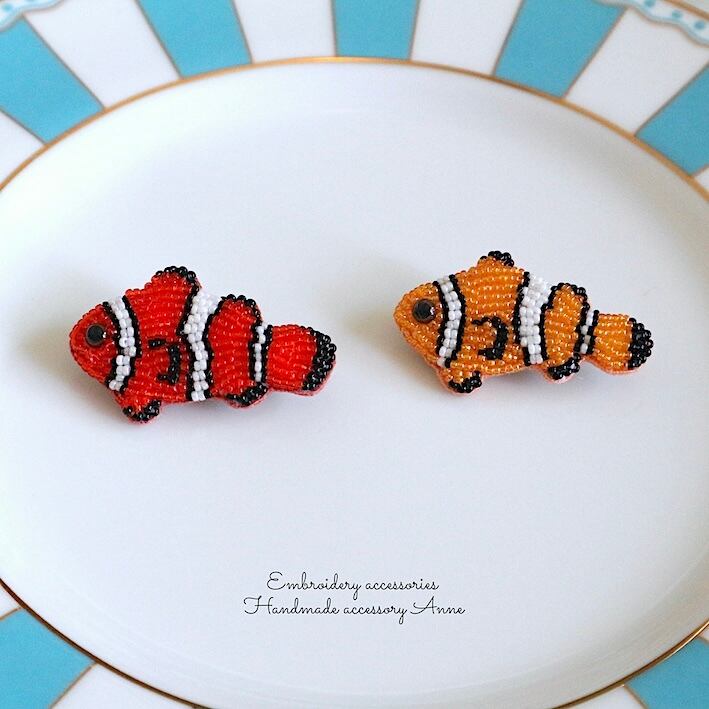 海の中の交ざりけのない原色のお魚を透明感あるビーズで表現しました。