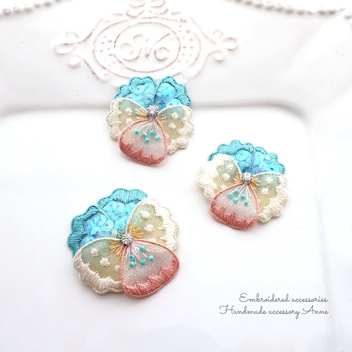 オーガンジーに糸、ビーズ、スパンコールなどで刺繍したパンジーです。