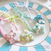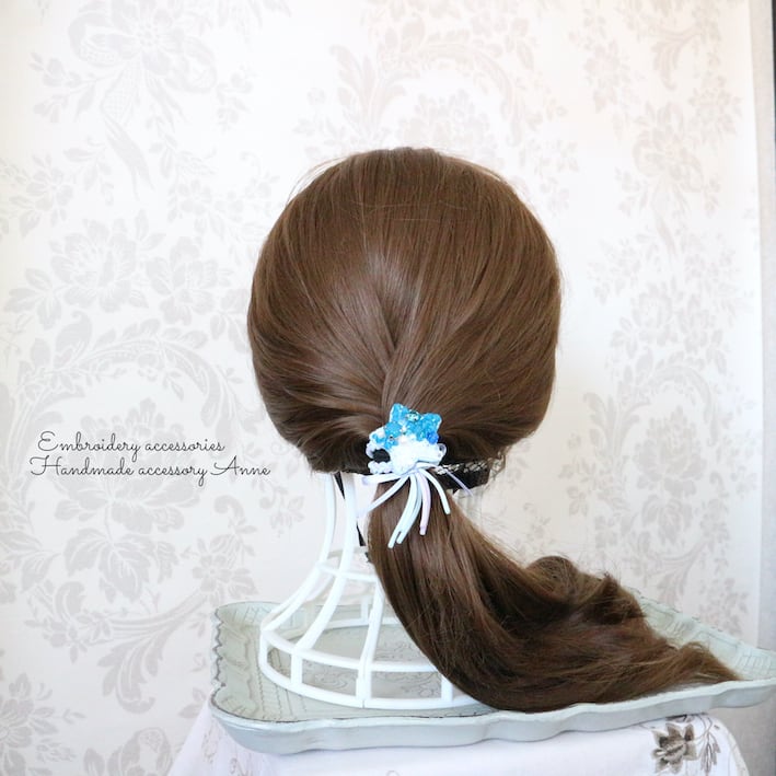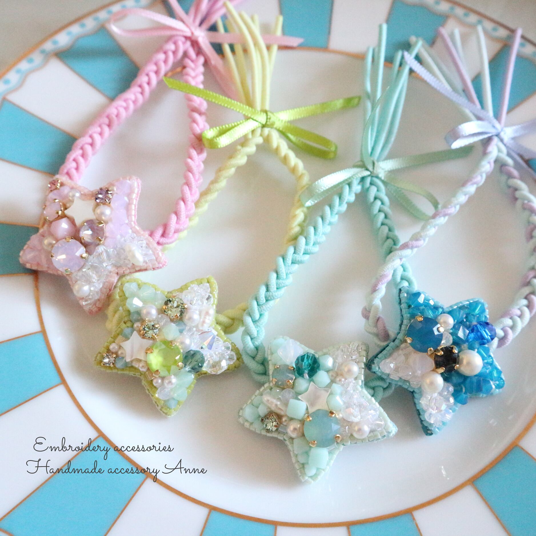 パステルカラーのビーズやスワロフスキー、パールなどで刺繍した星型のヘアゴムです。