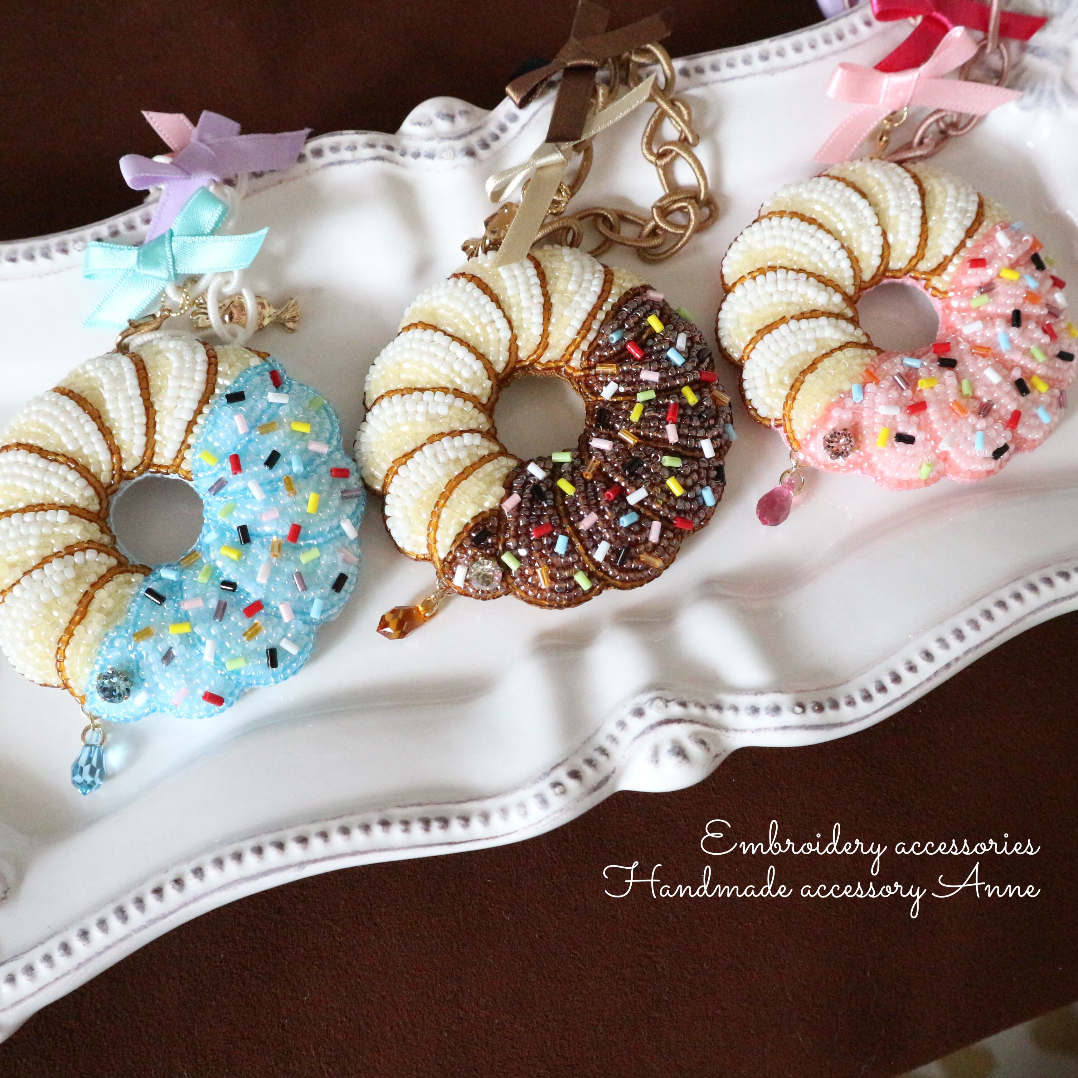 ビーズで刺繍したフレンチクルーラーのバッグチャームです。